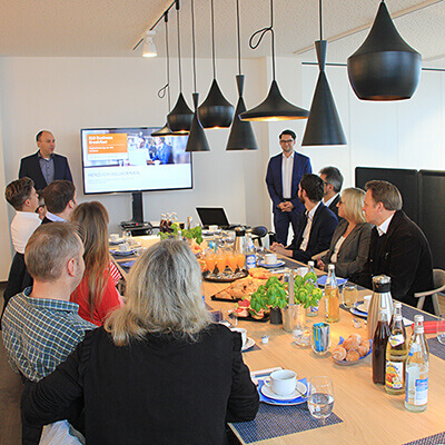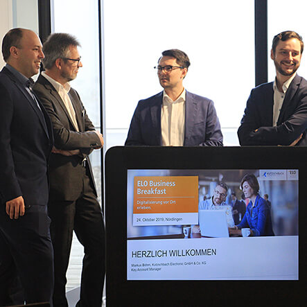 zu Gast haben wir heute ELO Digital Office und viele Interessenten für das Digitalisieren von Geschäftsprozessen. Arthur Schummer und Thomas Rausch von ELO stellen gemeinsam mit Markus Böhm und Karl-Heinz Lantzsch die Digitalisierung des Rechnungseingangsmanagements und des Bewerbermanagements vor. Ein reichhaltiges Frühstück stärkt die Teilnehmer.